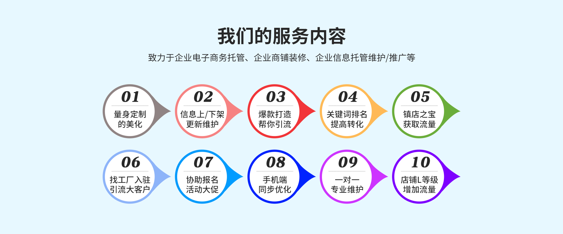 公司秉承"顾客第一,服务至上,合作共赢"的理念,为更多的企业提供更多的电商服务,创造更好的商业效果, 煜赫与全体员工一起,共同发展,做好服务,已经获得多家客户的认可及肯定。杭州煜赫将以最专业的精神、尽心尽力的服务为您提供最满意有效的解决方案,用自己的一份力量,推动社会的进步。